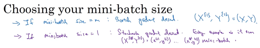mini-batch size를 m으로 설정한다면, 매 iteration마다 아주 많은 training sets을 처리하게 되고, m이 너무 크다면 긴 시간이 소요된다. 만약 m이 작다면 batch GD를 그냥 사용해도 괜찮다.