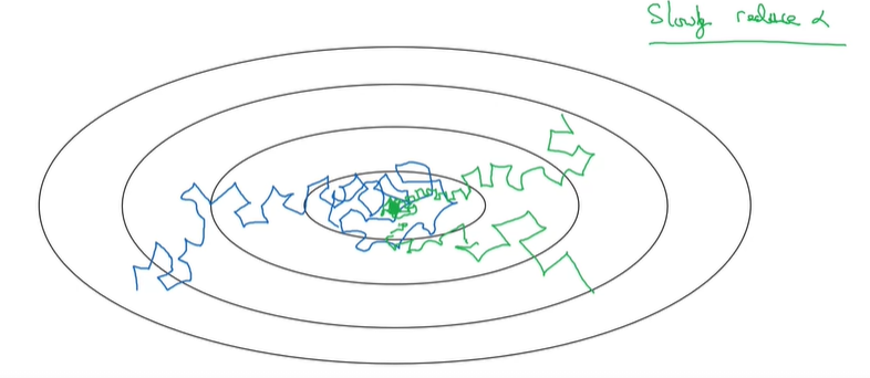 하지만 만약 learning rate \(\alpha\)를 천천히 감소시킨다면, 초기 반복에서는 비교적 큰 learning rate로 빠르게 학습이 가능할 것이다. 그리고, learning rate가 점점 감소하면서 step이 점차 작아질 것이다. 결국에는 최소값 부근에서 매우 좁은 범위를 왔다갔다할 것이다. 이전처럼 큰 learning rate를 가지고 최고값 주변을 왔다갔다하는 것과 비교하면 훨씬 나을 것이다.