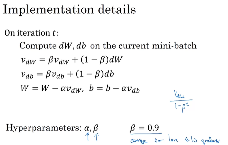 위와 같이 정리할 수 있고, 여기서 Hyperparameter는 \(\alpha, \beta\) 2가지이다. 보통 \(\beta\)의 값은 0.9가 default이며, 이것은 지난 10번의 Gradient Descent의 평균치를 의미한다.