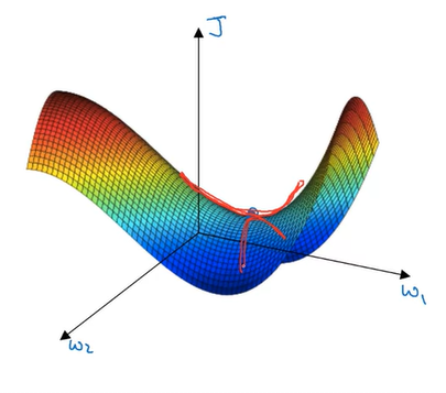이런 경우에는 local optima가 매우 많이 존재하고, 학습 알고리즘이 global minimum이 아닌, local optima에 수렴하는 경우가 쉽게 발생할 것이다. 위와 같이 그래프를 그리게 되면, 다수의 local optima를 쉽게 만들 수 있다는 것을 발견할 수 있지만, 실제로는 이 그래프는 올바르지 않다. NN 네트워크를 새로 만들게 되면, 기울기가 0인 지점이 항상 이렇게 local optima인 것은 아니고, Cost Function에서 기울기가 0인 대부분의 지점들은 saddle point이다.