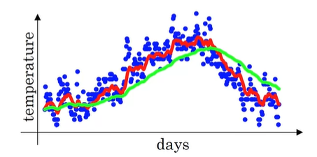 하지만, 위 공식은 정확한 평균 계산 방식은 아니다. 정확한 평균은 최근 10일이나 50일의 기온을 더하고 10이나 50으로 나누면 더 좋은 추정치를 얻을 수 있지만, 이 방법은 그 동안의 기온을 보관하고 더하려면 더 많은 메모리가 필요하고 구현도 더 복잡하고 연산의 부담도 커지게 되는 단점이 있다.