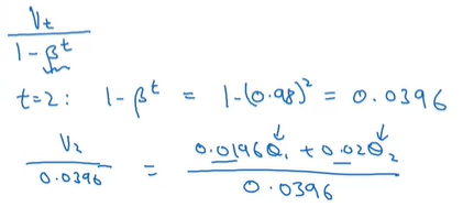 이렇게 특히 초반 부분에 대해서는 좋은 평균치가 아니게 되는데, 이런 평균치를 보완해주기 위한 방법이 Bias Correction이다.