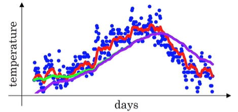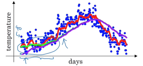 여기서 \(V_t\)는 대략적으로 \(\frac{1}{1 - \beta}\) days의 평균 기온이 된다.