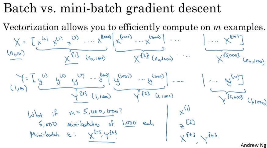 새로운 표기법이 등장하는데, 1000개의 examples로 묶은 set를 중괄호를 사용해서 \(x^{\{1\}}\)로 표현하고, 그 다음 set를 \(x^{\{2\}}\)로 표현한다. 이렇게 각각의 mini-batch들이 1000개의 example들을 가지게 되면, 이 mini-batch들은 총 5,000개가 된다. 최종적으로 \(x^{\{5,000\}}\)가 된다. Y에 대해서 동일하게 나누어주어야 한다.