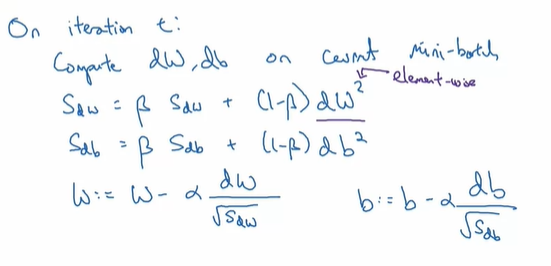 \[W := W - \alpha \frac{dW}{\sqrt{S_{dW}}}, b := b - \alpha \frac{db}{\sqrt{S_{db}}}\]
