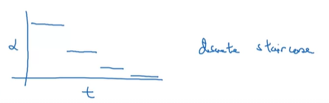 \[\alpha = \frac{1}{1 + \text{decay rate }\ast\text{ epoch-num}}\alpha_0\]