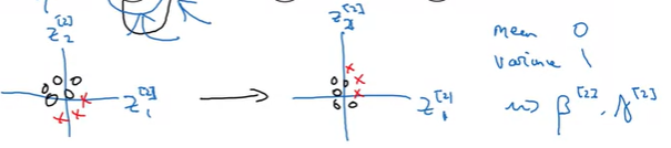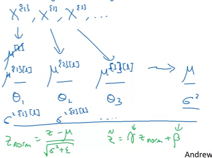 엄밀히 말하자면 \(z^{[2]}\)를 normalization하는 것인데, \(z_1^{[2]}, z_2^{[2]}, z_3^{[2]}, z_4^{[2]}\)가 이전 layer의 파라미터들을 업데이트하면서 변할 수 있는데, batch normalization은 이 값들이 변경되더라도 평균값과 분산은 똑같게 유지해준다.(평균 1, 분산 0으로 만들 수도 있으며, 다른 값으로 유지시키는 것도 가능. 이것은 \(\beta^{[2]}, \gamma^{[2]}\)를 통해서 조절)