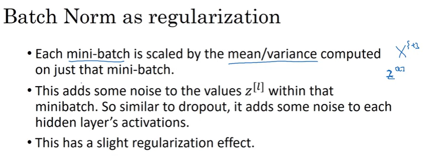 각 mini-batch에서는 해당되는 mini-batch의 데이터로만 mean/variance를 계산했기 때문에 전체 샘플로 했을 구했을 때보다 더 noisy하고, 결과적으로 \(\widetilde{z}^{[l]}\) 또한 noisy해 질 것이다. 그 결과, dropout과 유사하게 hidden layer activation에 noisy를 더하게 되는 것이고, 이로 인해서 regularization의 효과가 발생하는 것이다. 그러나 noisy의 정도는 작기 때문에, 큰 효과는 없다(dropout을 같이 사용할 수 있다).