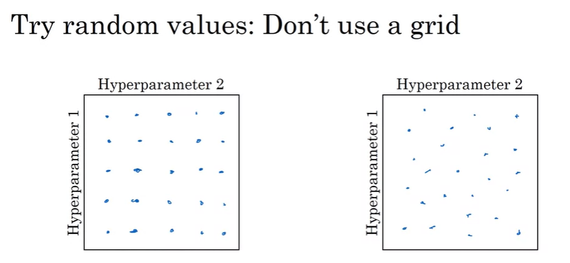 우리가 작업하는 app에서 어떤 하이퍼파라미터가 더 중요한지 미리 알아내기 어렵기 때문에, 격자판 형식으로 샘플링하는 것보다 무작위로 샘플링하는 방법이 더 많은 하이퍼파라미터 값을 탐색해볼 수 있기 때문에, 더 광범위하게 학습을 진행할 수 있다.