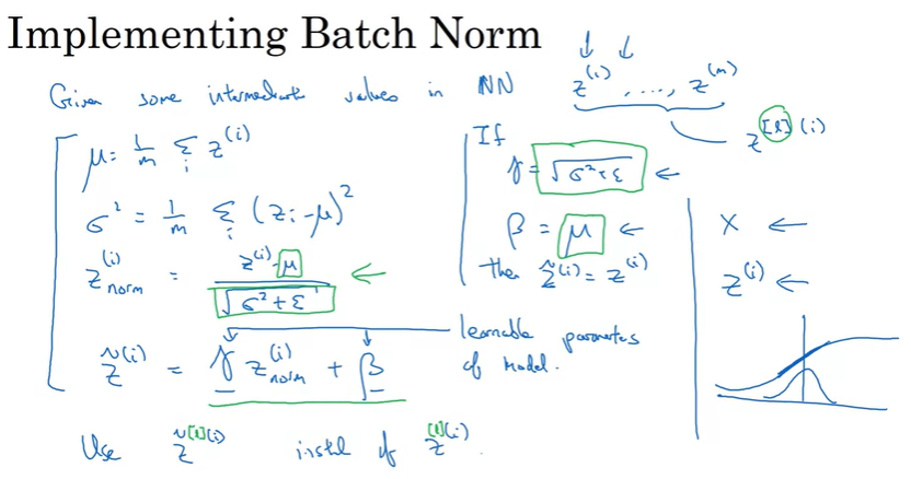 추가적으로 만약 \(\gamma = \sqrt{\sigma^2 + \epsilon}, \beta = \mu\)로 설정한다면, \(\widetilde{z}^{(i)} = z^{(i)}\)가 되는 것과 동일하다.(기존 input값 유지)