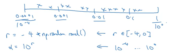파이썬에서는 -4 * np.random.rand()로 -4에서 0사이의 값을 임의로 균일하게 선택하고, 10의 지수로 사용하면, 0.0001에서 1 사이의 값을 더 적절하게 샘플링할 수 있다.