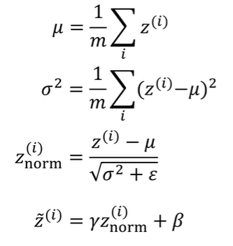 어떤 hidden layer \(l\)에서 hidden unit 값 \(z^{(1)}, \cdots, z^{(m)}\)가 주어졌을 때, 평균(mean)과 분산(variance)와 Normalization은 다음과 같이 구할 수 있다.(\(^{[l]}\)은 생략함)