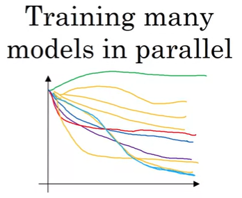 다른 방법으로는 Training many models in parallel인데, 이 방법은 parallel 방식으로 여러 모델을 한 번에 학습하는 방법이다. 어느 한 모델에 대해서 어떤 하이퍼파라미터의 값을 설정해서 학습할 수 있고, 또 다른 모델은 다른 하이퍼파라미터의 값으로 설정해서 학습할 수 있다. 따라서 여러 모델에 대한 그래프인 아래와 같은 learning curve를 얻을 수 있을 것이다.