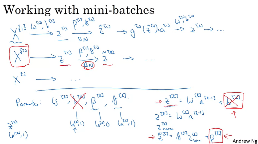 그리고 파라미터에서 \(b^{[l]}\)은 무시될 수 있는데, batch norm에서 평균값을 구하고, input에 평균값을 빼기 때문에 상수항을 더하는 것은 아무런 효과가 없어지기 때문이다. 따라서 이 파라미터를 제거하거나 0으로 설정할 수 있다.