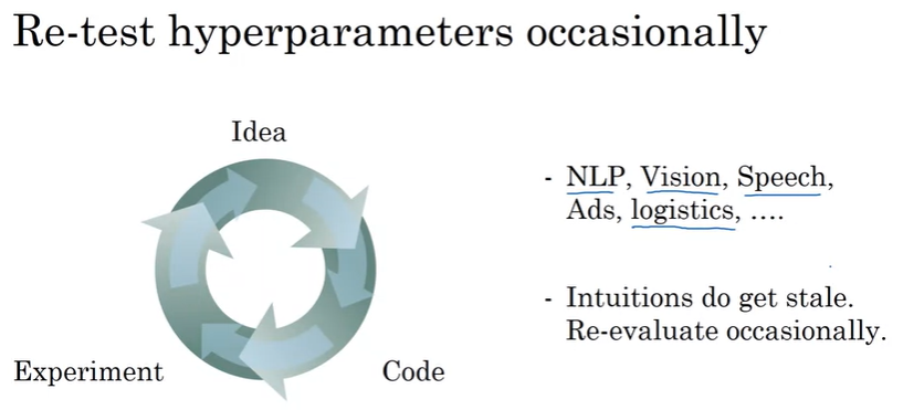 그리고, 모델을 학습하고 적절한 하이퍼파라미터의 값을 찾았더라도, 시간이 지나면서 데이터가 변하거나, 데이터센터의 서버를 업그레이드하거나, 이러한 변화들 때문에 우리가 찾은 하이퍼파라미터의 값이 더 이상 최적의 파라미터가 아니게 될 수 있다. 그렇기 때문에 retesting하거나 하이퍼파라미터를 re-evaluate하는 것을 추천한다.(몇개월에 한번)