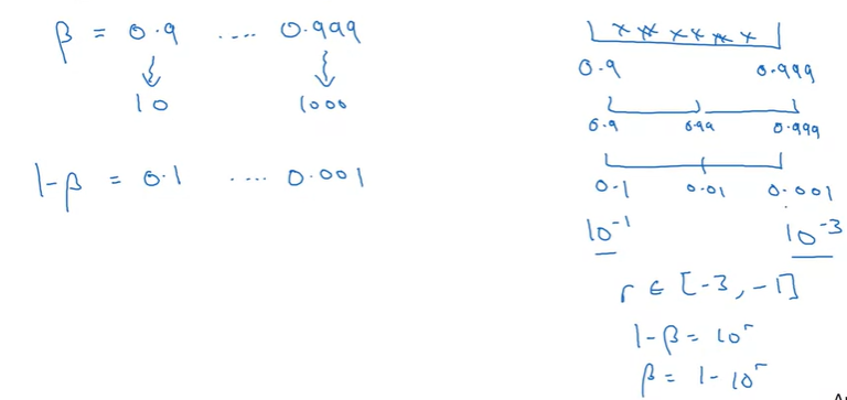 Exponentially Weighted Averages의 \(\beta\) 하이퍼파라미터 샘플링은 조금 헷갈릴 수 있는데 한 번 알아보도록 하자. 적절한 \(\beta\)의 값은 0.9에서 0.999사이의 값이라고 하면, 우리가 탐색해야되는 범위도 0.9 ~ 0.999가 된다.