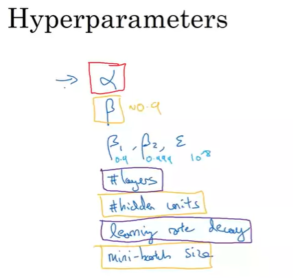 하이퍼파라미터 중에서 \(\alpha\)가 가장 중요하며, 다음으로 노란색 박스의 하이퍼파라미터(\(\beta\), # of hidden units, mini-batch size)가 중요하고, 다음으로는 보라색 박스인 # of layer, learning rate decay가 중요하다고 할 수 있다.
