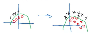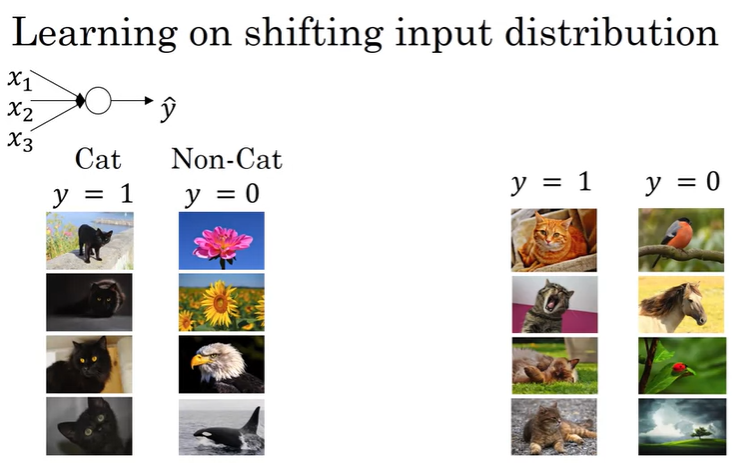 왼쪽은 검은 고양이사진 샘플일 때의 데이터 분포이고, 오른쪽은 색깔이 있는 고양이의 데이터 분포가 될 수 있다. 그래서 왼쪽의 샘플로들로만 학습된 모델의 경우에는 오른쪽 색깔이 있는 고양이에 대해서 일반화가 안되어서 분류가 잘 안될 수 있다. 이렇게 데이터의 분포가 변하는 것을 covariate shift라고 불리는데, 만약 입력 x의 분포도가 변경되면 학습 알고리즘을 다시 학습시켜야 할 수도 있다(위와 같이 판별 함수가 변경되지 않더라도).