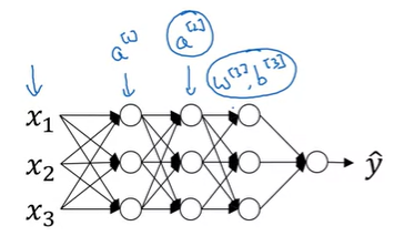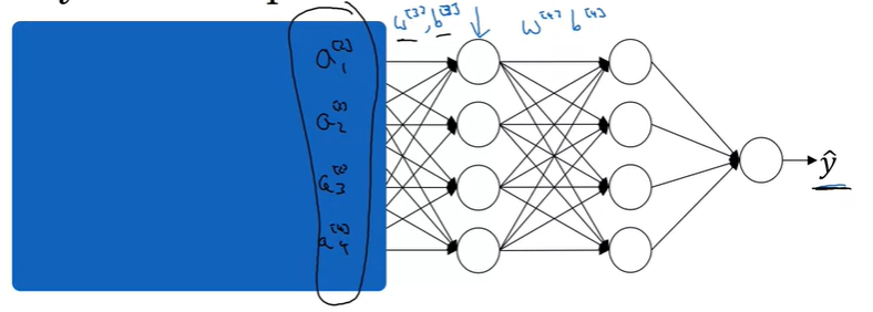 input x에서부터 network는 \(W^{[1]}, b^{[1]}, W^{[2]}, b^{[2]}\)를 사용할 것이고, \(W^{[1]}, b^{[1]}, W^{[2]}, b^{[2]}\)가 변경되면, \(a^{[2]}\)의 값들도 변경될 것이다.