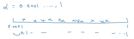 이번에는 learning rate \(alpha\)를 탐색한다고 해보자. 이 경우에는 0.0001에서 1 사이의 값으로 임의로 균일화되게 샘플링을 진행하면, 약 90%의 값이 0.1과 1 사이에 있을 것이다. 즉, 샘플링의 90% 정도를 0.1에서 1 사이의 값에 집중하게 되는 것이고, 10% 정도만이 0.0001과 0.1 사이의 값에 집중하는 것이다.