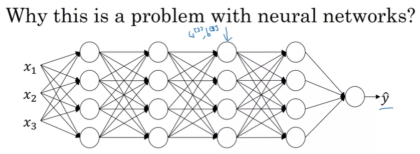 위와 같은 NN이 있다고 할 때, 우리는 일단 3번째 layer를 기준으로 살펴볼 것이다. 이 layer에서는 \(W^{[3]}, b^{[3]}\)을 학습했을 것이다. 그리고 3번째 layer 기준으로 feature의 값을 이전 layer에서 계산된 값으로 사용하는데, hidden layer 3의 역할은 \(a_1^{[2]}, a_2^{[2]}, a_3^{[2]}, a_4^{[2]}\)를 입력으로 사용해서, 이 값들을 통해서 \(\hat{y}\) 값으로 매핑할 것이다.(GD를 진행하면서 \(W^{[3]}, b^{[3]}, W^{[4]}, b^{[4]}, W^{[5]}, b^{[5]}\) 이런 파라미터를 학습해서 네트워크가 \(a_1^{[2]}, a_2^{[2]}, a_3^{[2]}, a_4^{[2]}\)값에 대해서 매핑을 잘할 수 있게 된다)
