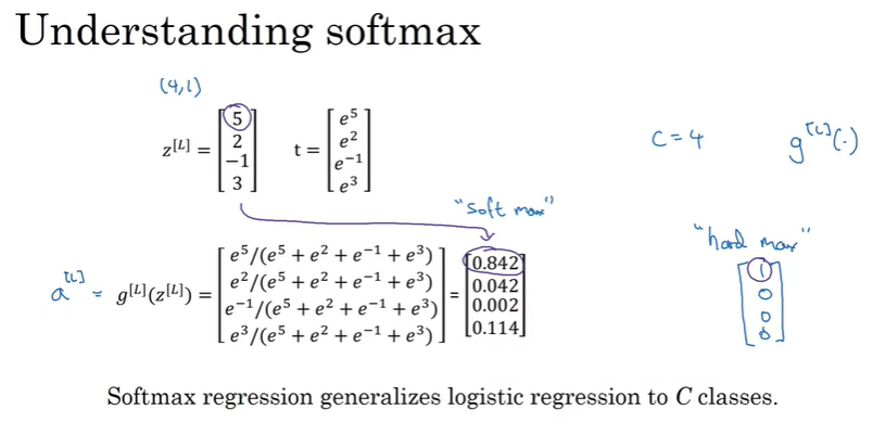 \[a^{[L]} = \frac{t}{176.3} = \begin{bmatrix} \frac{e^5}{176.3} = 0.842 \\ \frac{e^2}{176.3} = 0.042 \\ \frac{e^{-1}}{176.3} = 0.002 \\ \frac{e^3}{176.3} = 0.114 \end{bmatrix}\]