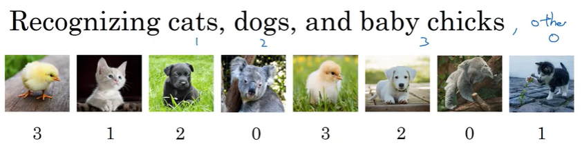 그리고 위와 같은 NN(neural network)이 있을 때, output layer의 unit의 개수는 4가 될 것이고, 일반적으로 C가 될 것이다. 이 output layer은 4개의 class들의 확률을 나타내는 것이고, 첫 번째 노드는 other class일 확률을 결과값으로 나타내고, 두 번째 unit은 고양이일 확률, 세번째 unit은 강아지일 확률, 네번째 unit은 병아리일 확률을 나타낸다.