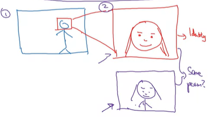 먼저, 첫번째 감지기는 사람의 얼굴이 이미지의 어디에 있는지 알아낸다. 그리고 그 사람의 얼굴을 발견하면, 그 이미지 부분을 자르고 확대해서 얼굴이 가운데로 오게 한다. 그런 다음에 이 이미지를 NN에 입력으로 사용해서 학습을 해서 동일인물인지 비교하는 방법 등을 통해서 사람의 ID를 파악할 수 있다.