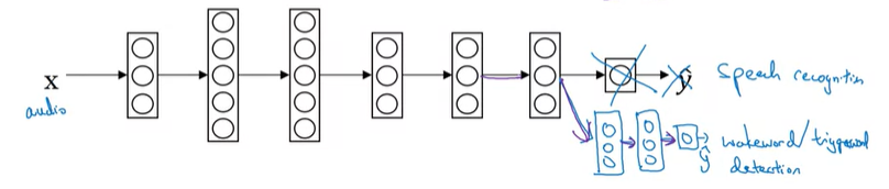 우리가 음성 인식 시스템을 학습했다고 한다면, 입력 x는 오디오가 될 것이고, y는 해석(ink transcript)가 될 것이다. 이제, 우리는 wake word(trigger word)를 감지하는 시스템을 만들고 싶어한다면, NN의 마지막 layer를 삭제하고 새로운 output layer를 만들어야 한다. 종종, 마지막 output layer를 하나로만 생성하는 게 아니라, 여러개의 새로운 layer를 생성할 수도 있다. 그리고, 우리가 학습시키고자 하는 data를 얼마나 보유하고 있느냐에 따라서, 새롭게 생성한 layer만 학습하느냐 또는 더 많은 layer들을 학습하느냐 선택할 수 있다.