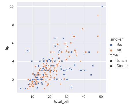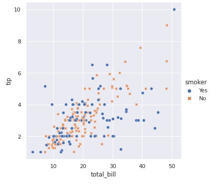 여기서는 smoker정보를 추가했으며, tip을 낸 사람이 흡연자인지 아닌지 확인할 수 있는 정보입니다. 또한, 이러한 class 구분을 강조하기 위해서 마커 스타일을 변경할 수 있는데, 이것은 style 매개변수를 통해서 가능합니다.