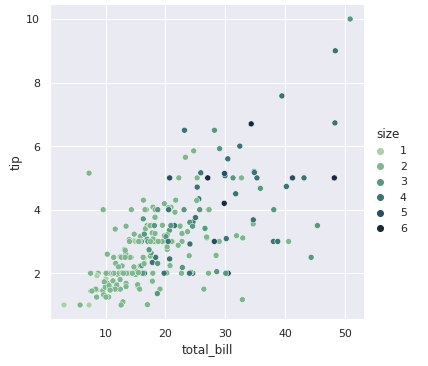 지금까지 smoker나 time 변수 값이 카테고리였기 때문에, 기본적으로 qualitative palette가 적용되었습니다. 만약 hue semantic이 numeric(수치)일 경우에는 기본 색상이 sequential palette로 변경되며, 그라데이션으로 색이 지정됩니다.