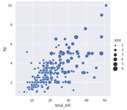 sns.relplot(x="total_bill", y="tip", size="size", sizes=(15, 200), data=tips)