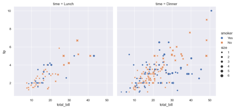 hue와 style 매개변수를 사용했는데, 각각 다른 변수를 사용해서 총 4개의 변수를 그래프에 나타낼 수 있습니다. 하지만 그래프가 조잡해질 수도 있으므로 주의해서 사용해야합니다. 예제에서는 style에 time 변수를 추가해서, tip을 낸 시간대의 정보를 마커로 구분해서 나타내고 있습니다.