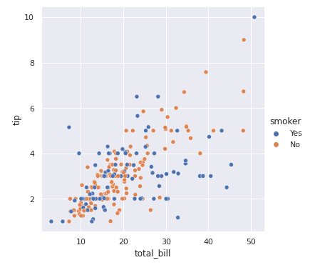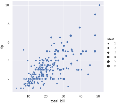 위에서 언급했지만, scatterplot()은 relplot()의 default이며, relplot()의 매개변수 kind="scatter"를 사용해서 지정할 수도 있습니다.