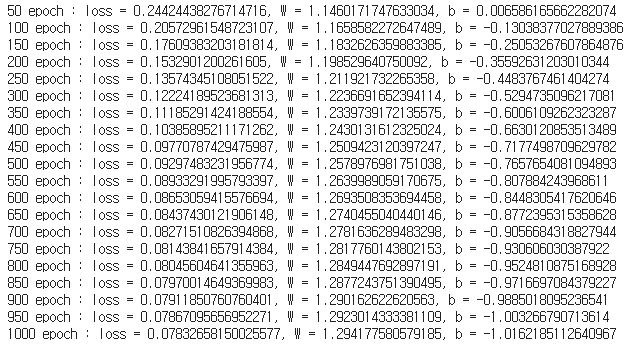 print(f'{epoch} epoch : loss = {loss}, W = {W.numpy()}, b = {b.numpy()}')