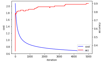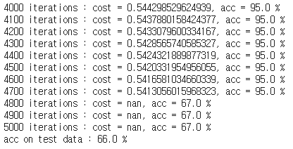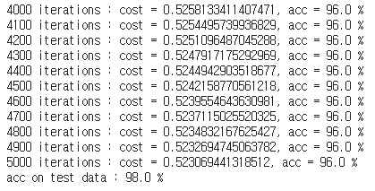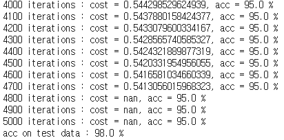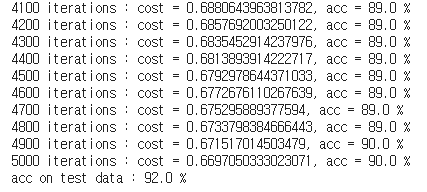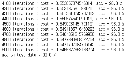 print(f'{iter} iterations : cost = {cost}, acc = {acc*100} %')