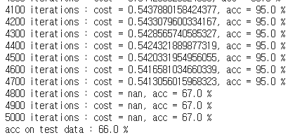 동일하게 cost에 nan가 나왔으나.. 이전과는 다르게 정확도가 유지되고 있습니다. 무슨 차이인지는 사실 잘 모르겠지만... 아마 파라미터가 유지되는 것으로 추측됩니다...